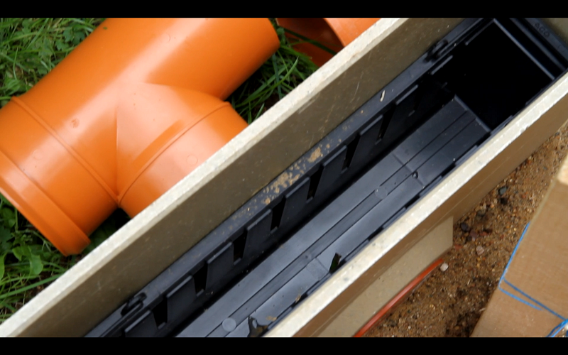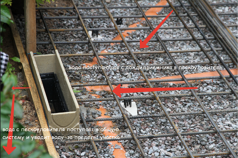 Сейчас мы показываем установленный пескоуловитель. Вода поступает с кровельных систем дома и пристроек прямо в дождеприемник, который задерживает грязь в сборной корзине, а жидкость далее направляется через трубопровод к пескоуловителю. Дождеприемники и система наружных каналов не видны для глаза, так как они накрыты металлической решеткой по цвету мощения брусчатки.