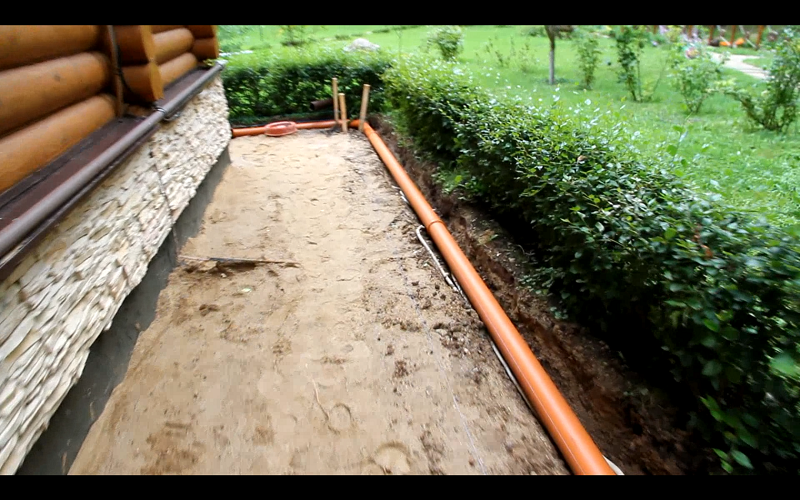 Далее, очищенная вода с пескоуловителя, направляется по трубопроводу в систему и быстро уходит за пределы участка. Таким способом, вода с кровли и с площадок вашего дома, не попадает на газон ,не создает застои воды. А в весенний период, система быстро дает возможность оттаиванию снега и не создает залежей льда.