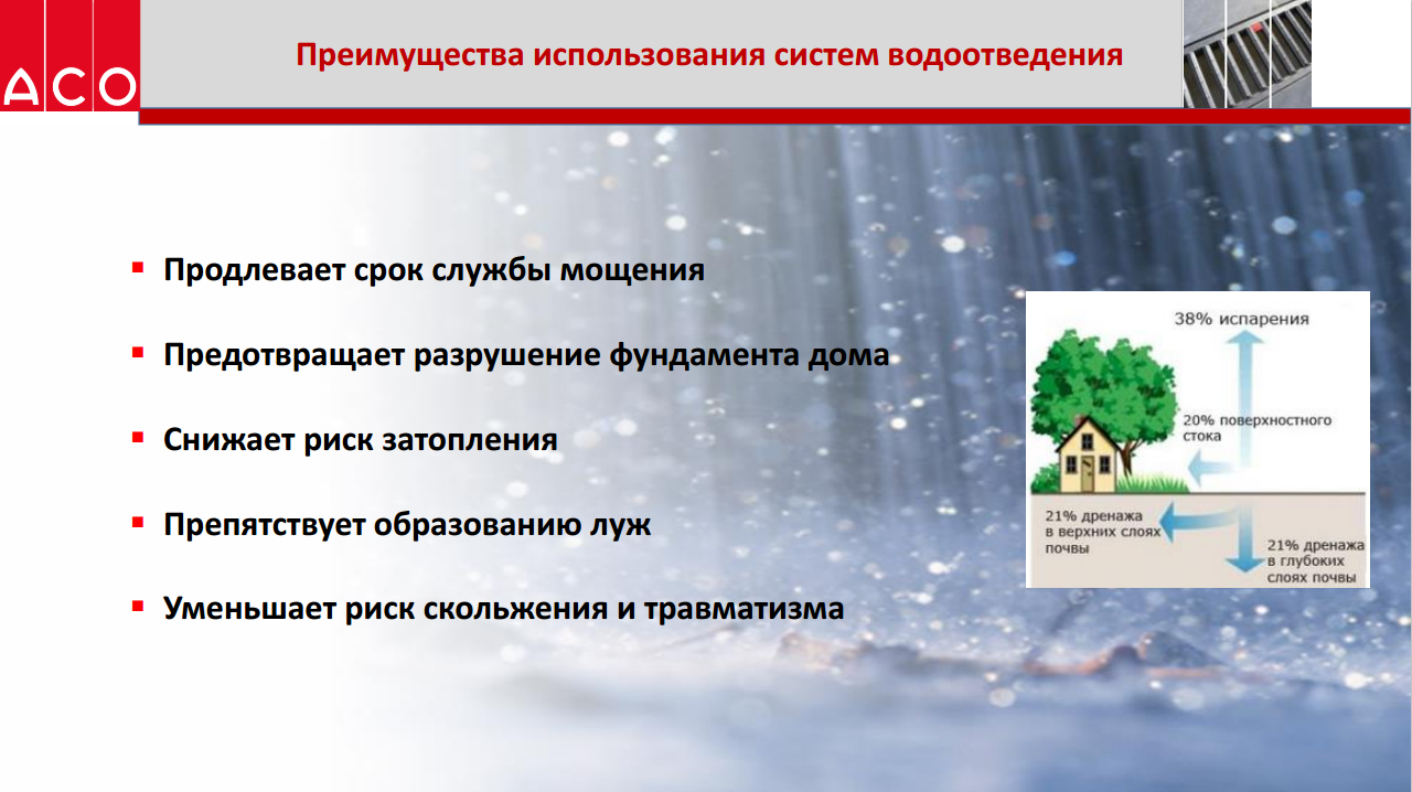 Системы отведения воды имеют большой ряд преимуществ. Они продлевают срок службы мощения, предотвращают разрушения фундамента дома и других сооружений из бетона, снижают риск затопления, предотвращают образование луж и залежей льда на ландшафте. И как следствие, такие системы уменьшают риск травматизма на участке.