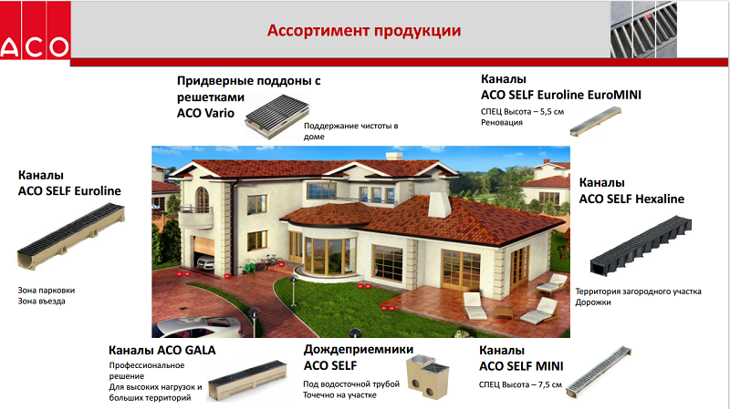 Ассортимент продукции Ако Селф позволяет монтировать систему в любые места. Каналы по высоте и длине, имеют разные формы, что позволяет захватить малые площади от нагрузки воды или достаточно большие.