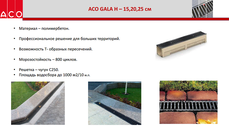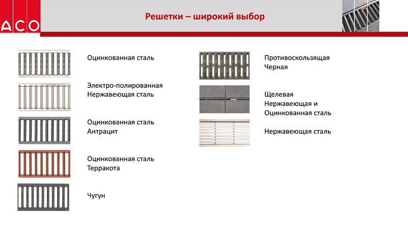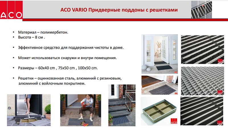 Такие элементы как придверные решетки на усмотрение заказчика, а каналы ACO Self Hexaline (Ако Селф Гексалайн) более глубокого и большого формата используются чаще в городской ландшафтной архитектуре или в местах технических сооружений.