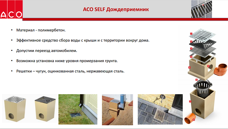 Ну и дождеприемники для приема воды с кровельных систем у дачных домов и сооружений. Дождеприемники Ако Селф имеют достаточную глубину ,чтобы увести воду под бетонным основанием.