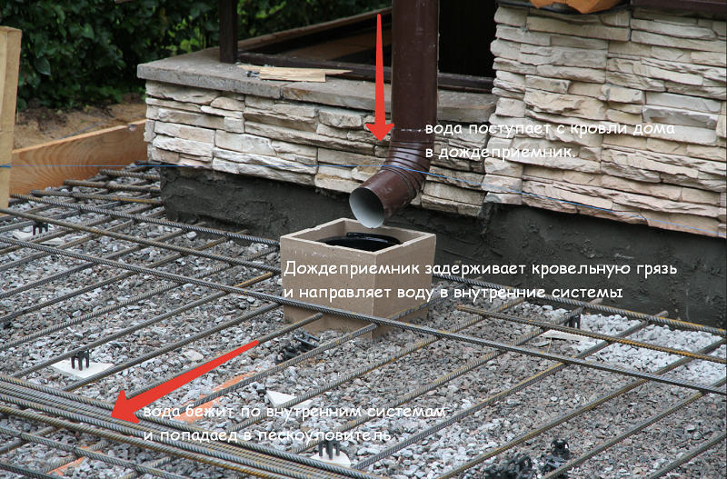 Дождеприемник играет роль приема воды с кровельной системы. Вода бежит по водосточным кровельным трубам и попадает в дождеприемник, в следствии в дождеприемнике оседает в приемной корзине листва и грязь, попавшая вместе с водой по водосточным системам.